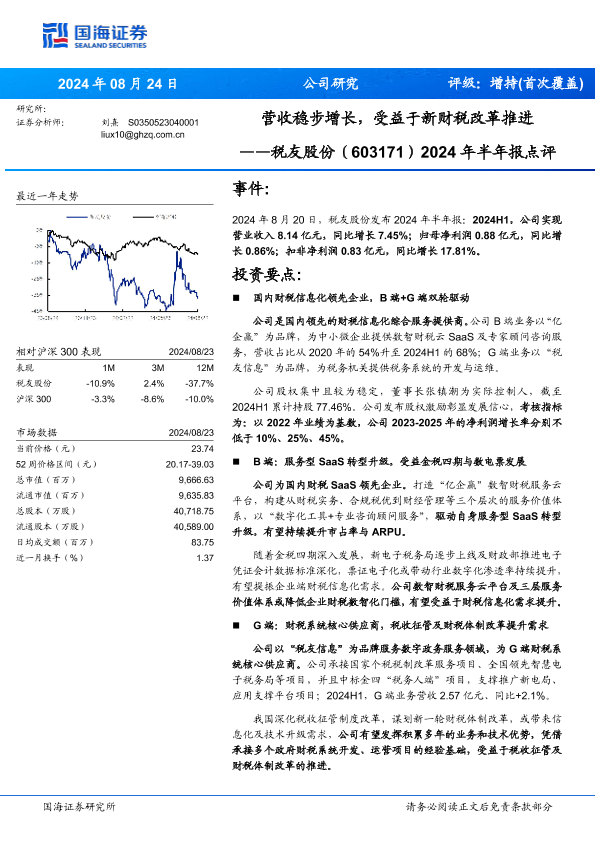 【国海证券】【20240824】税友股份(603171)2024年半年报点评:营收稳步增长,受益于新财税改革推进-15页