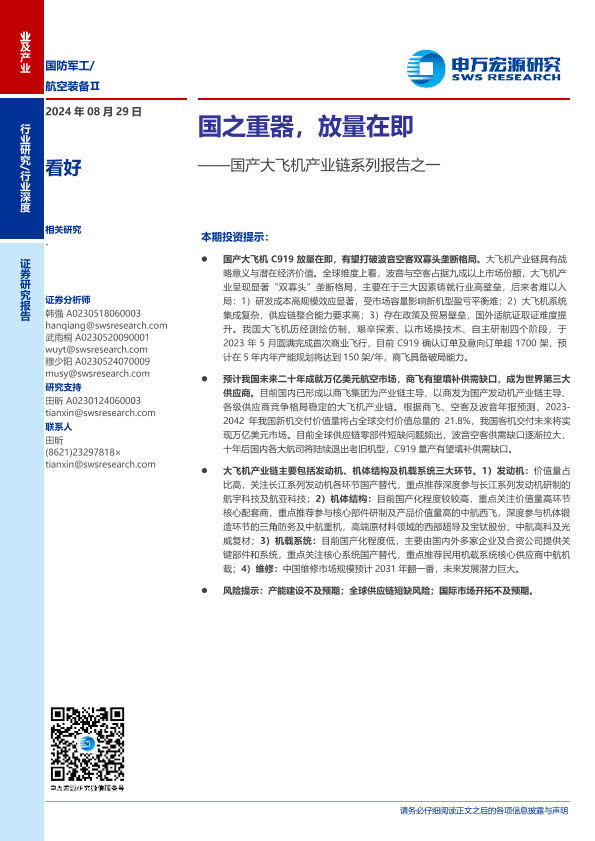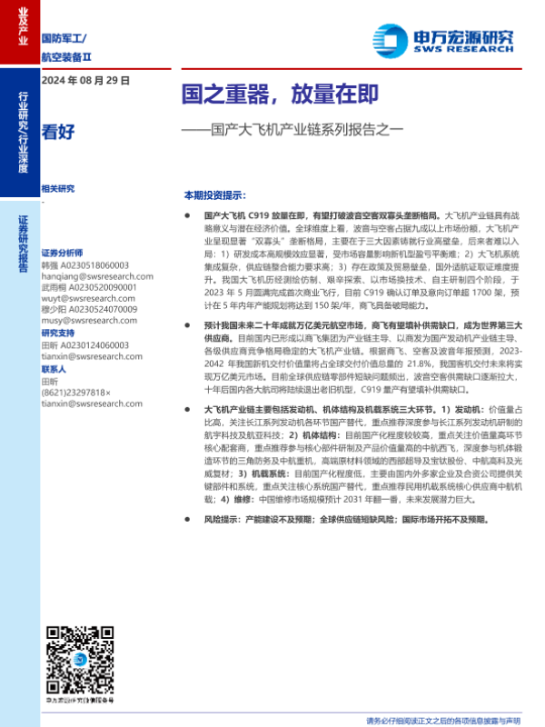 【申万宏源】【20240829】航空装备行业国产大飞机产业链系列报告之一:国之重器,放量在即-62页