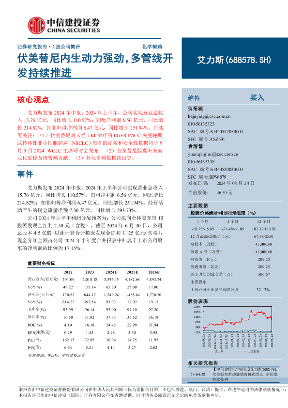 【中信建投证券】【20240824】艾力斯(688578)伏美替尼内生动力强劲,多管线开发持续推进-10页