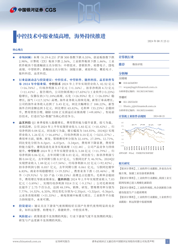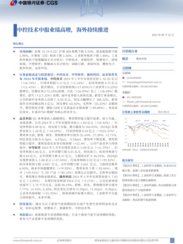 【银河证券】【20240825】计算机行业跟踪报告:中控技术中报业绩高增,海外持续推进-13页
