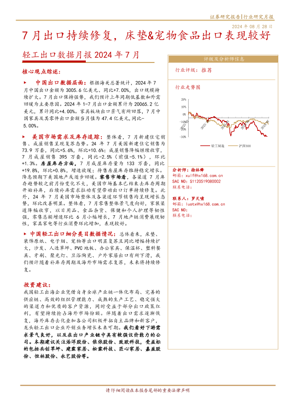 【华西证券】【20240828】轻工行业出口数据月报2024年7月:7月出口持续修复,床垫&宠物食品出口表现较好-13页