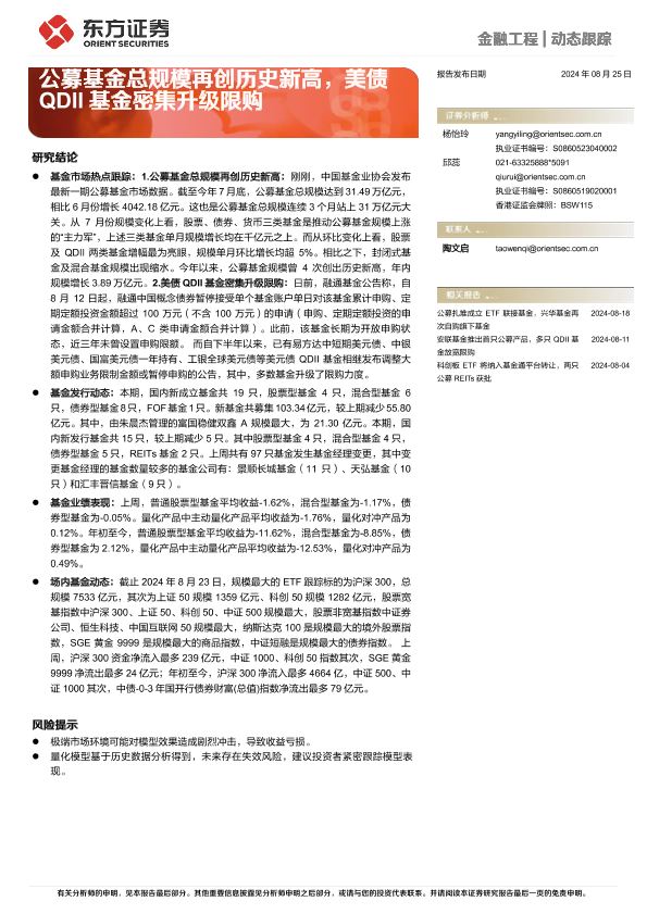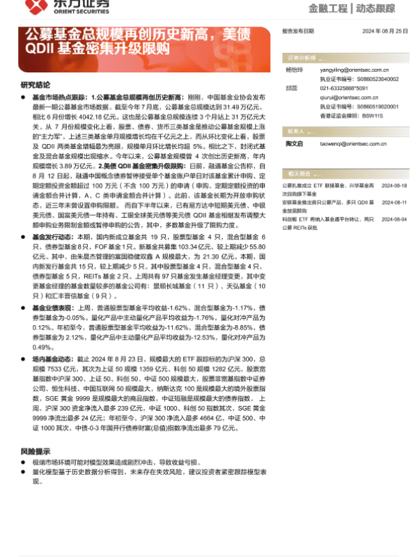 【东方证券】【20240825】金融工程动态跟踪:公募基金总规模再创历史新高,美债QDII基金密集升级限购-14页