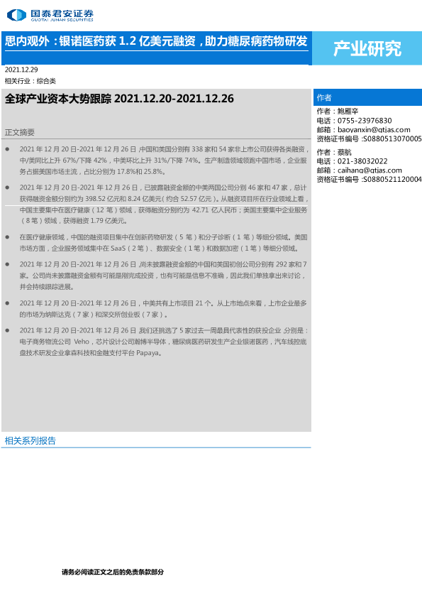 【国泰君安证券】【20211229】全球产业资本大势跟踪:思内观外,银诺医药获1.2亿美元融资,助力糖尿病药物研发-29页
