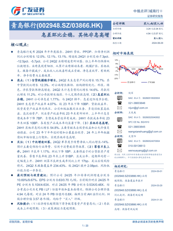 【广发证券】【20240829】青岛银行(002948)息差环比企稳,其他非息高增-23页