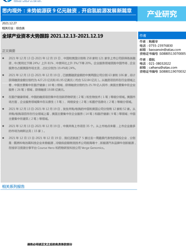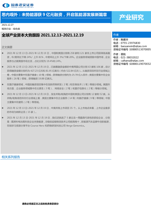 【国泰君安证券】【20211227】全球产业资本大势跟踪:思内观外,未势能源获9亿元融资,开启氢能源发展新篇章-33页