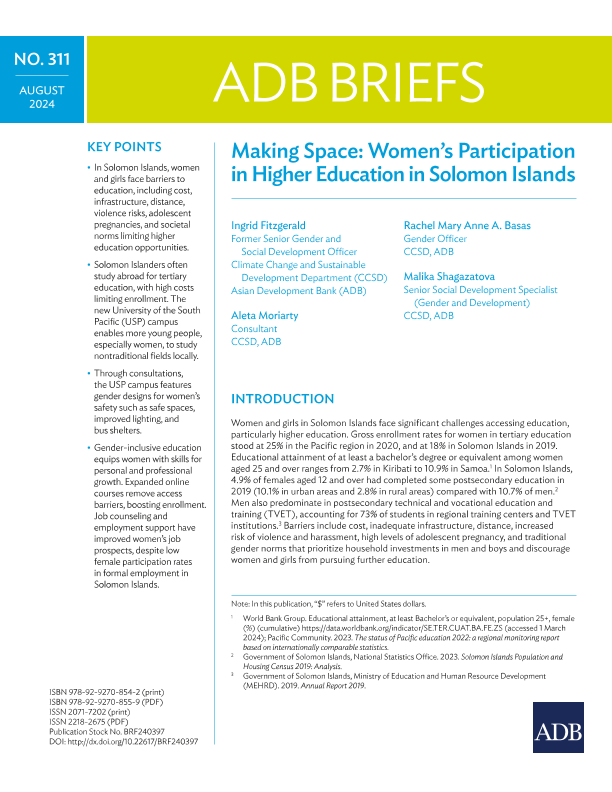 【Asian Development Bank】【202408】Making Space Women’s Participation in Higher Education in Solomon Islands-8页