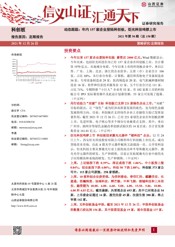 【山西证券】【20211226】动态跟踪2021年第50期(总150期):年内157家企业登陆科创板,炬光科技鸣锣上市-23页