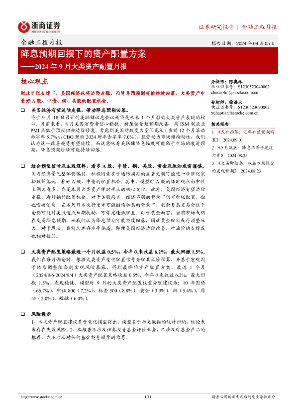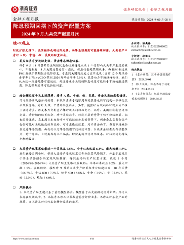 【浙商证券】【20240905】2024年9月大类资产配置月报:降息预期回摆下的资产配置方案-11页