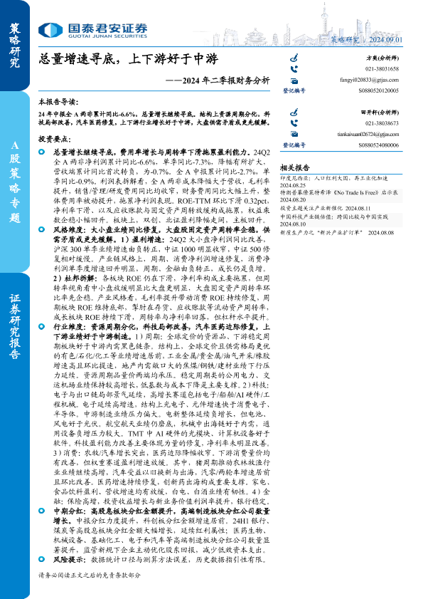 【国泰君安证券】【20240901】2024年二季报财务分析:总量增速寻底,上下游好于中游-22页