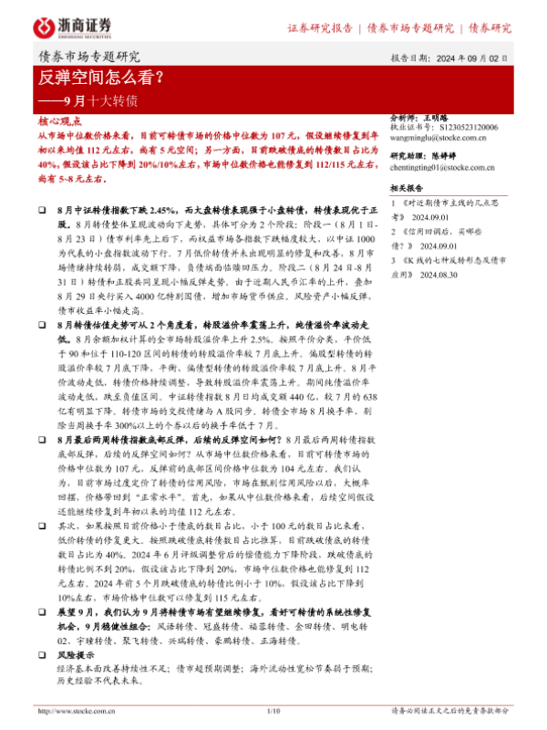 【浙商证券】【20240902】9月十大转债:反弹空间怎么看?-10页