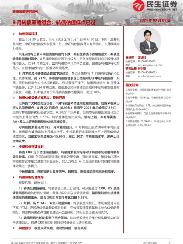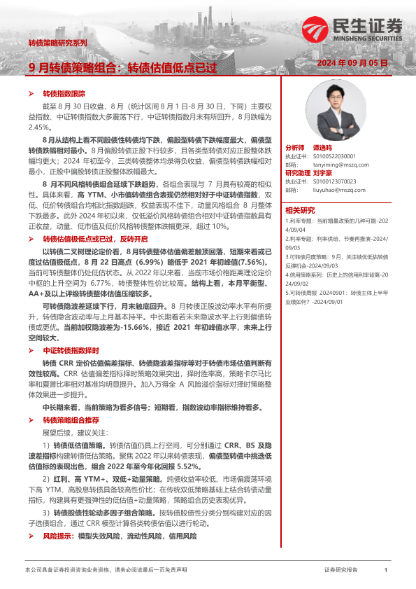 【民生证券】【20240905】9月转债策略组合:转债估值低点已过-20页