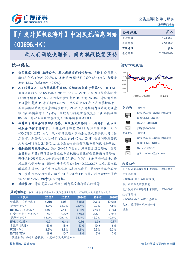 【广发证券】【20240904】中国民航信息网络(00696.HK)收入利润较快增长,国内航线恢复强劲-10页