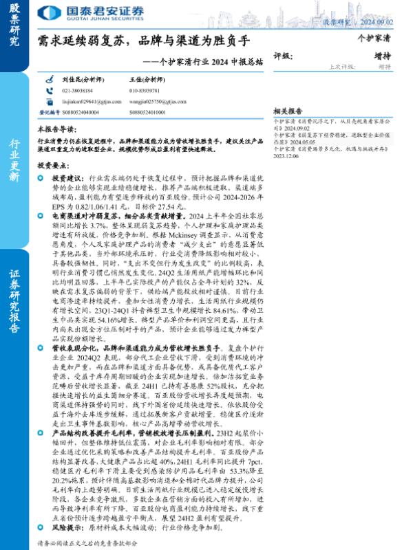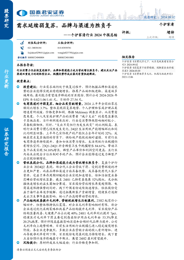 【国泰君安证券】【20240902】个护家清行业2024中报总结:需求延续弱复苏,品牌与渠道为胜负手-13页