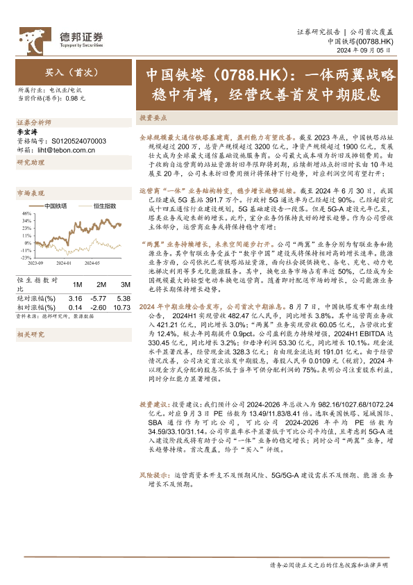 【德邦证券】【20240905】中国铁塔(00788.HK)一体两翼战略稳中有增,经营改善首发中期股息-23页