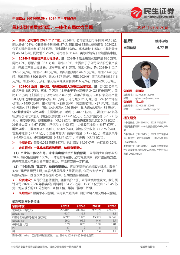 【民生证券】【20240902】中国铝业(601600)2024年半年报点评:氧化铝利润贡献可观,一体化布局优势显现-16页