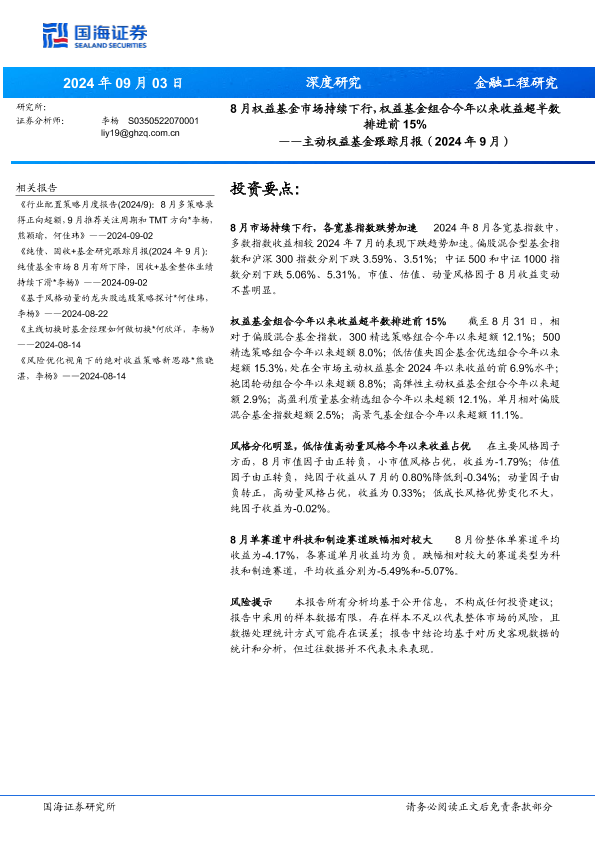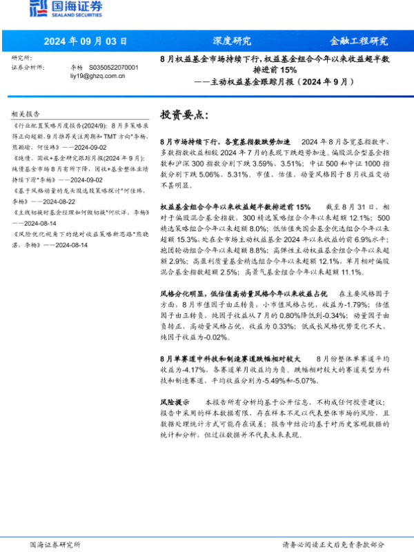 【国海证券】【20240903】主动权益基金跟踪月报(2024年9月):8月权益基金市场持续下行,权益基金组合今年以来收益超半数排进前15%-19页