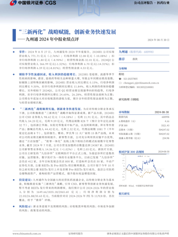 【银河证券】【20240830】九州通(600998)2024年中报业绩点评:“三新两化”战略赋能,创新业务快速发展-13页