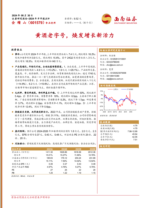 【西南证券】【20240830】会稽山(601579)2024年半年报点评:黄酒老字号,焕发增长新活力-14页