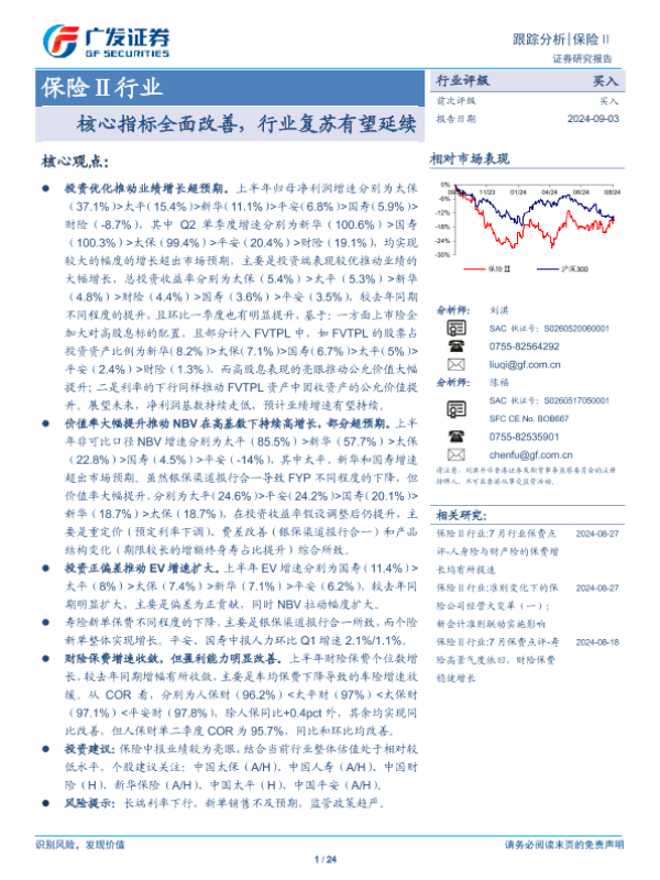 【广发证券】【20240903】保险Ⅱ行业:核心指标全面改善,行业复苏有望延续-24页