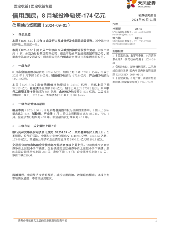 【天风证券】【20240901】信用债市场回顾:信用跟踪,8月城投净融资-174亿元-20页