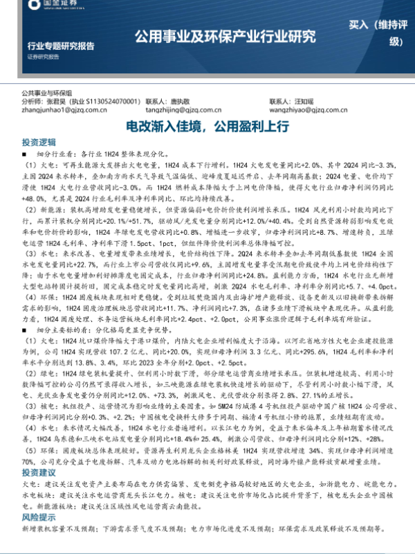 【国金证券】【20240831】公用事业及环保行业专题研究报告:电改渐入佳境,公用盈利上行-19页
