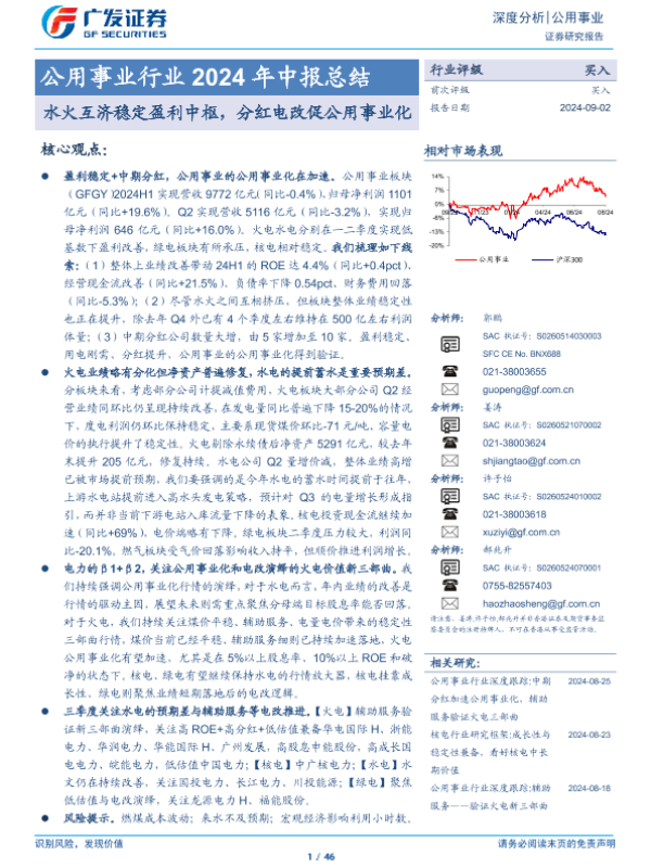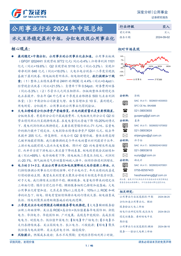 【广发证券】【20240902】公用事业行业2024年中报总结:水火互济稳定盈利中枢,分红电改促公用事业化-46页
