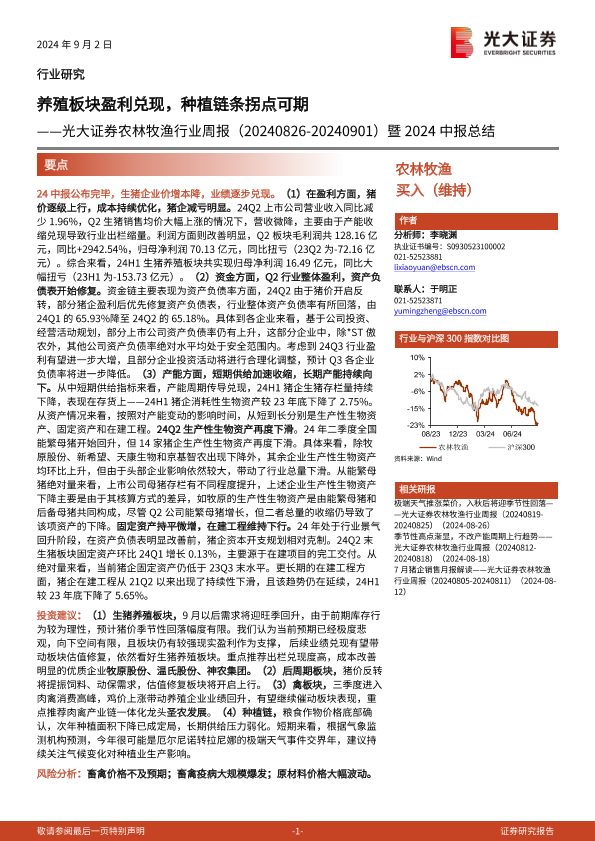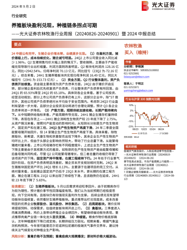 【光大证券】【20240902】农林牧渔行业周报暨2024中报总结:养殖板块盈利兑现,种植链条拐点可期-21页