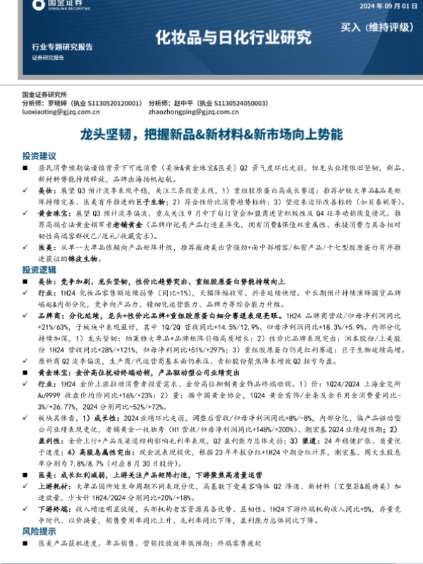 【国金证券】【20240901】化妆品与日化行业研究:龙头坚韧,把握新品&新材料&新市场向上势能-16页
