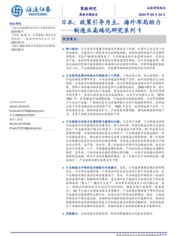 【海通证券】【20240904】日本:政策引导为主,海外布局助力——制造业高端化研究系列 1-18页