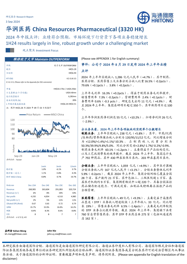 【海通国际】【20240903】华润医药(3320.HK)2024年中报点评:业绩符合预期,市场环境下行背景下各项业务稳健增长-11页