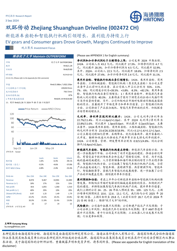 【海通国际】【20240903】双环传动(002472)新能源车齿轮和智能执行机构引领增长,盈利能力持续上行-12页