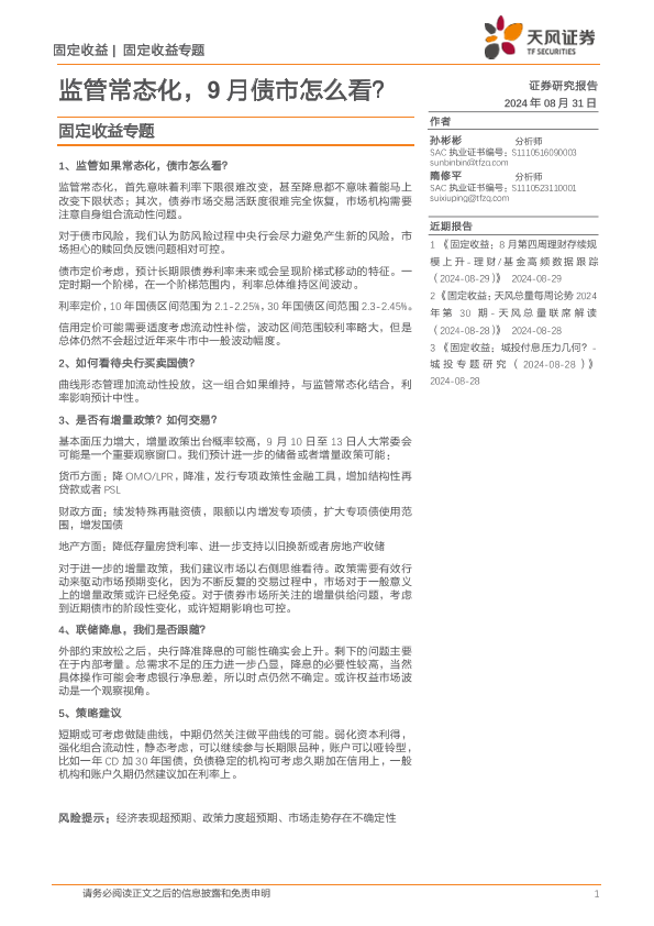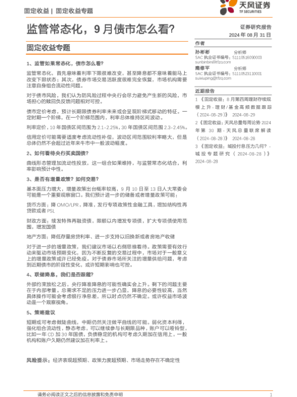 【天风证券】【20240831】固定收益专题:监管常态化,9月债市怎么看?-17页