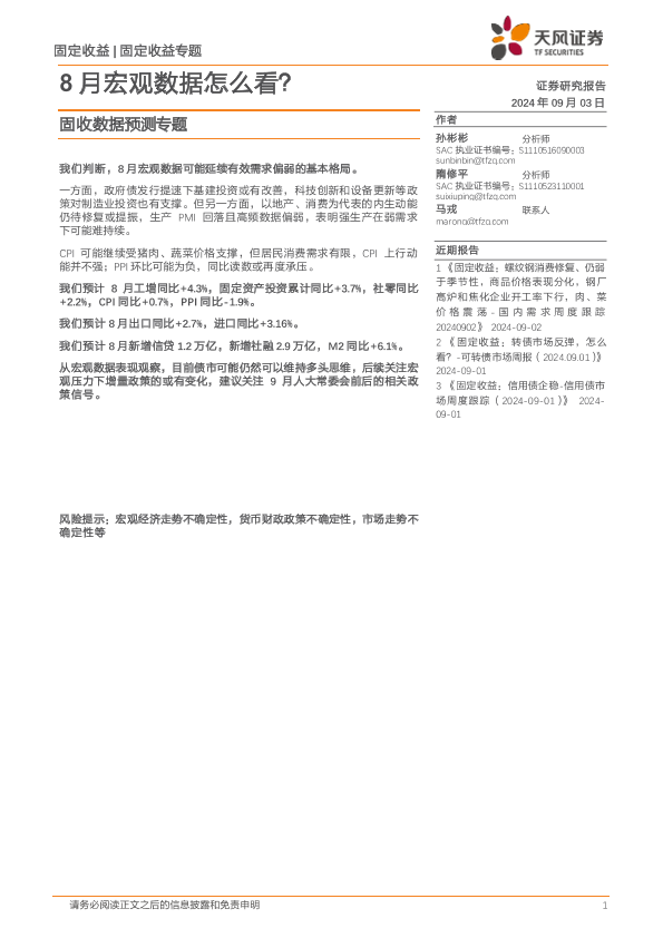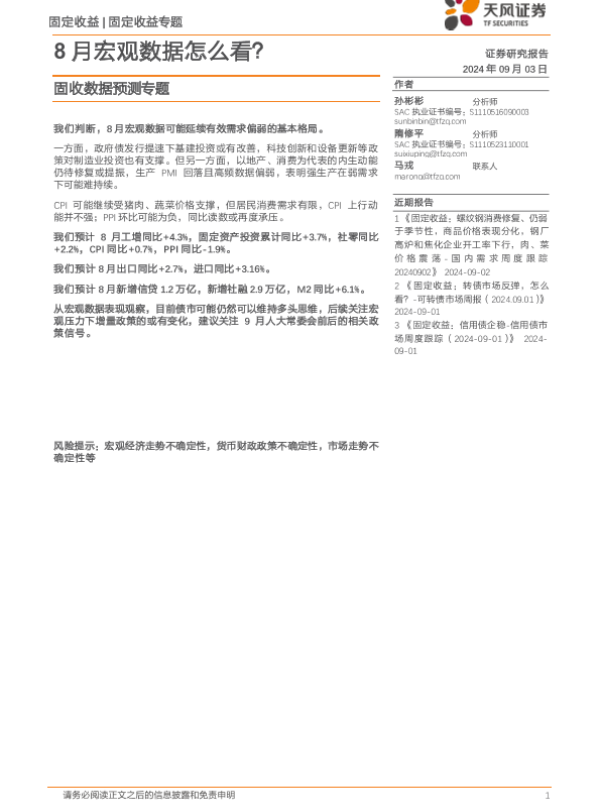 【天风证券】【20240903】固收数据预测专题:8月宏观数据怎么看?-19页