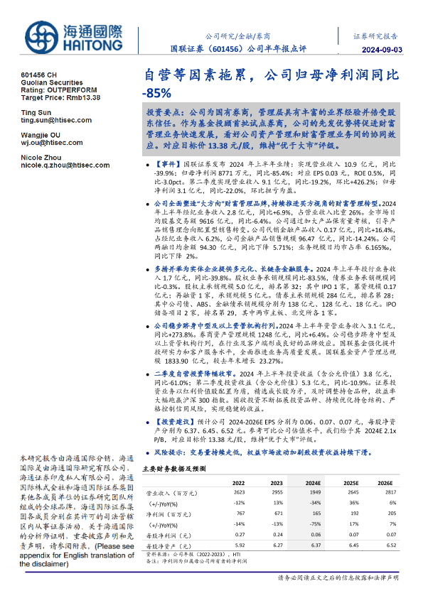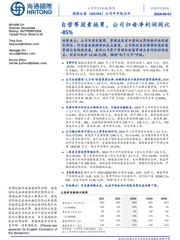 【海通国际】【20240903】国联证券(601456)公司半年报点评:自营等因素拖累,公司归母净利润同比-85%-14页