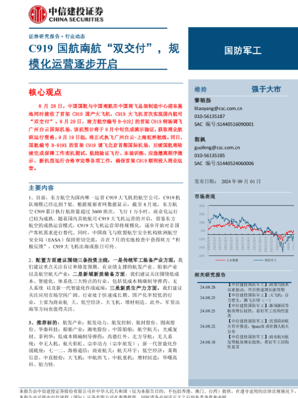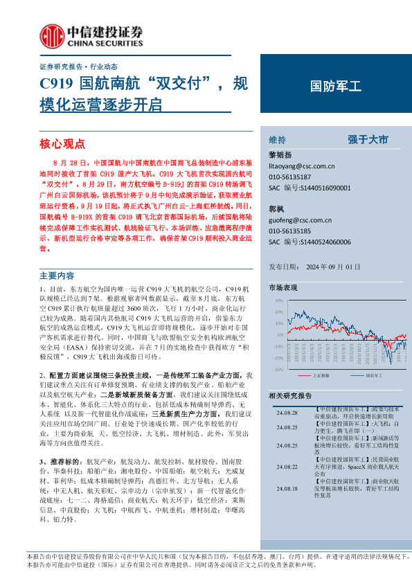 【中信建投证券】【20240901】国防军工行业:C919国航南航“双交付”,规模化运营逐步开启-24页
