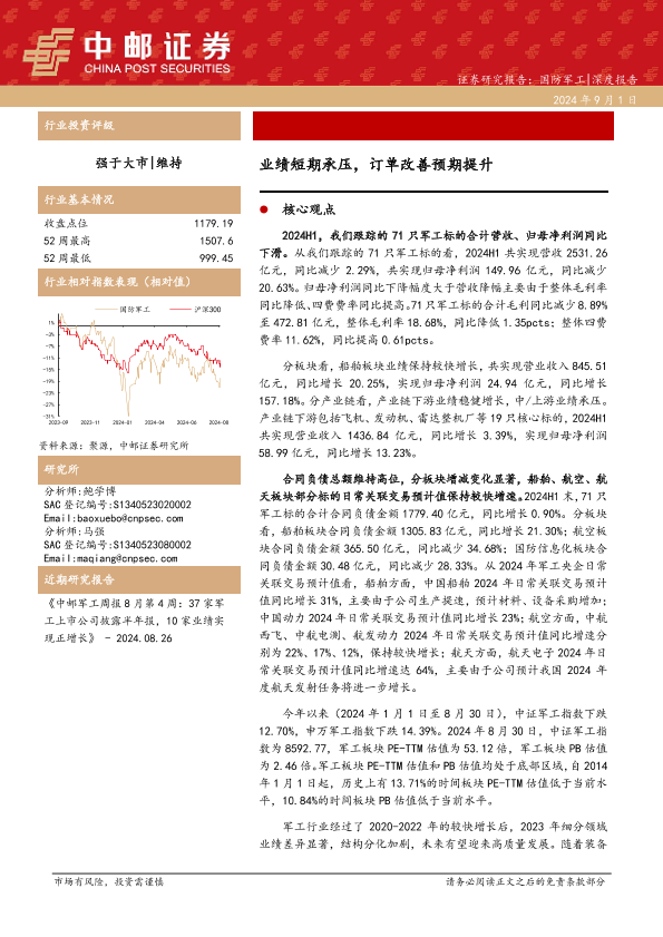 业绩分析 军工行业 国防装备 投资建议 订单改善