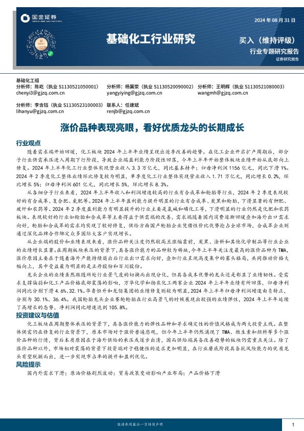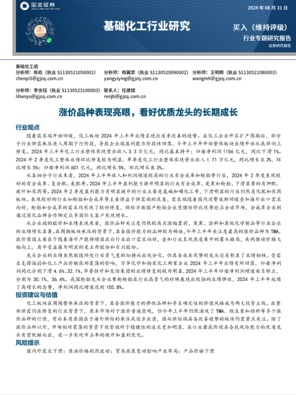 【国金证券】【20240831】基础化工行业专题研究报告:涨价品种表现亮眼,看好优质龙头的长期成长-47页