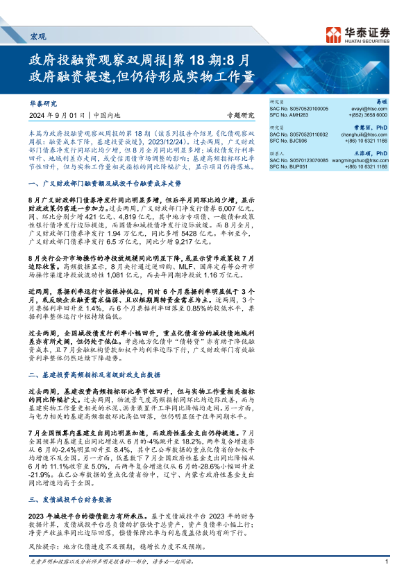 【华泰证券】【20240901】宏观专题研究-政府投融资观察双周报第18期:8月政府融资提速,但仍待形成实物工作量-26页