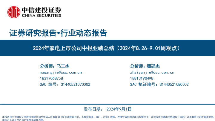 【中信建投证券】【20240901】2024年家电上市公司中报业绩总结(2024年8.26-9.01周观点)-33页