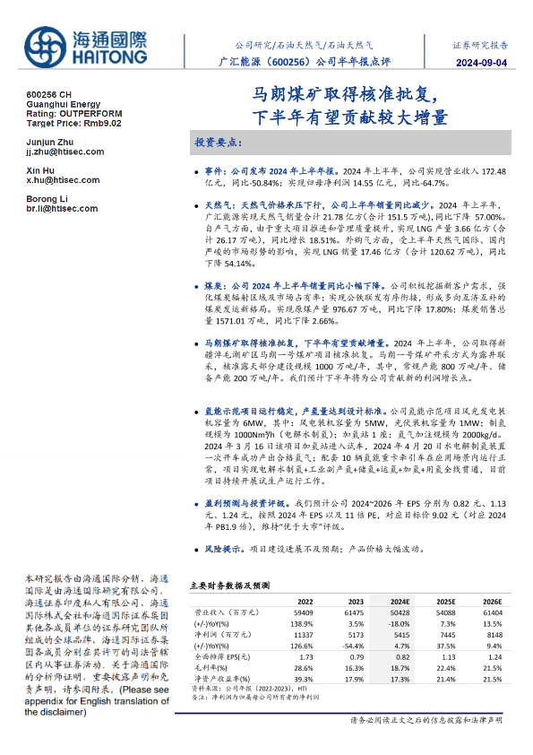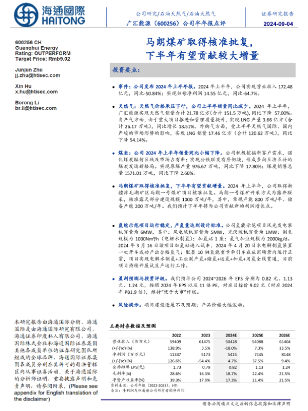 【海通国际】【20240904】广汇能源(600256)马朗煤矿取得核准批复,下半年有望贡献较大增量-12页