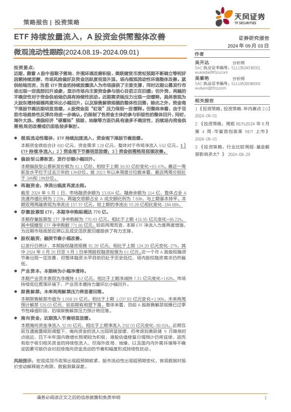 【天风证券】【20240903】微观流动性跟踪:ETF持续放量流入,A股资金供需整体改善-13页