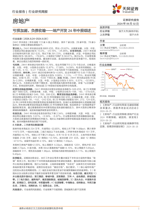 【天风证券】【20240902】房地产行业地产开发24年中报综述:亏损加剧,负债收缩-18页