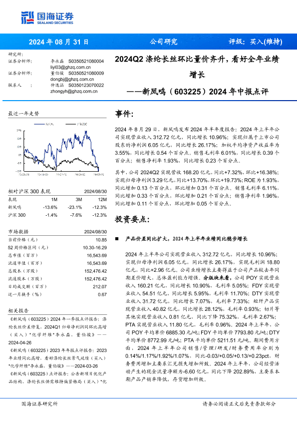 【国海证券】【20240831】新凤鸣(603225)2024年中报点评:2024Q2涤纶长丝环比量价齐升,看好全年业绩增长-11页