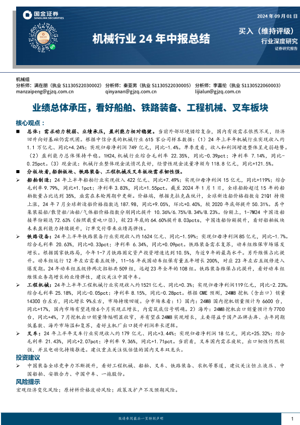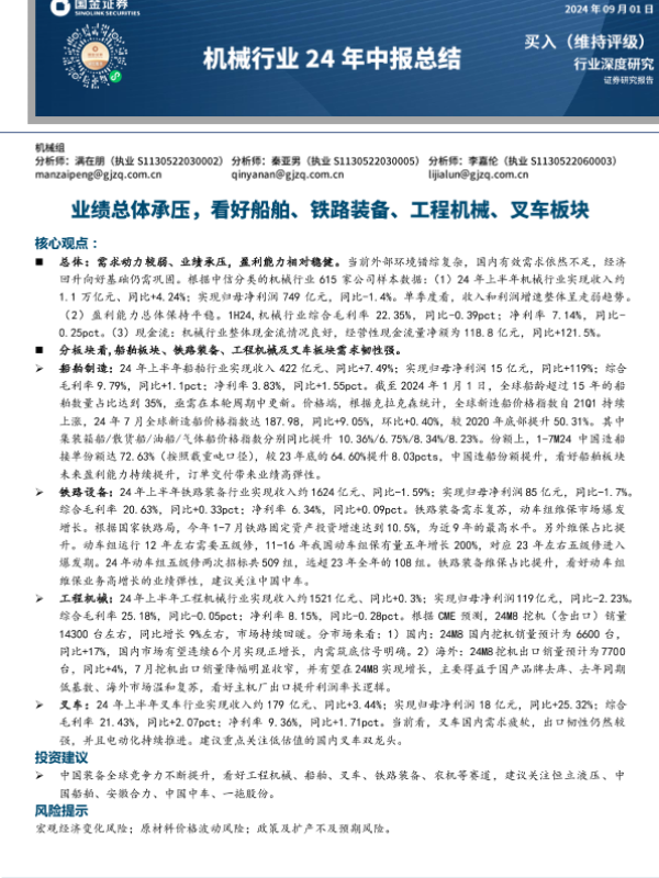 【国金证券】【20240901】机械行业24年中报总结:业绩总体承压,看好船舶、铁路装备、工程机械、叉车板块-14页