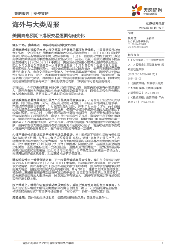 【天风证券】【20240905】海外与大类周报:美国降息预期下港股交易逻辑有何变化-14页