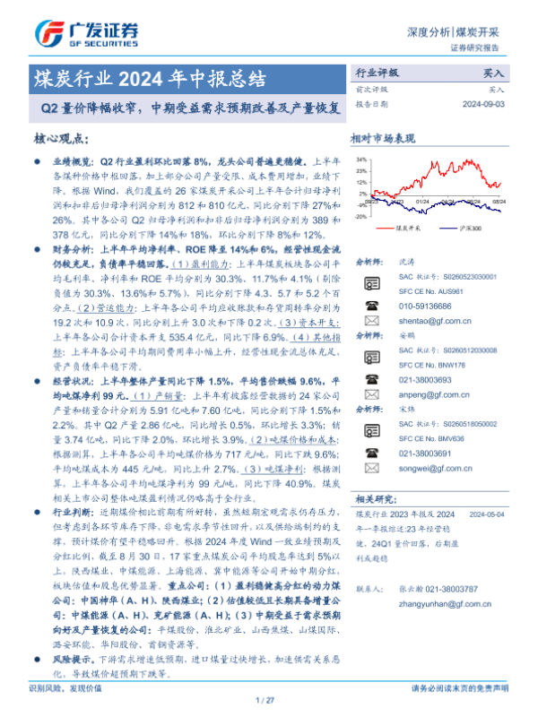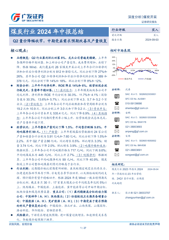 【广发证券】【20240903】煤炭行业2024年中报总结:Q2量价降幅收窄,中期受益需求预期改善及产量恢复-27页
