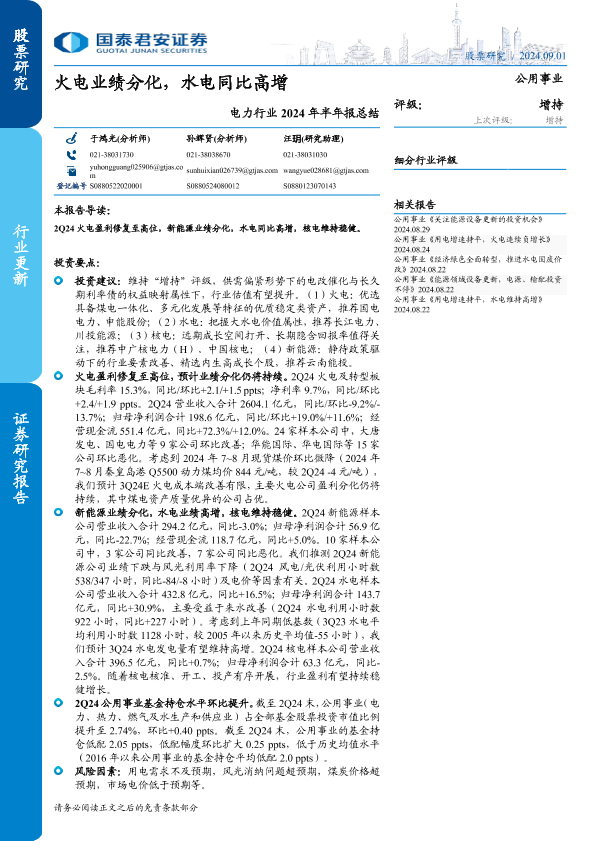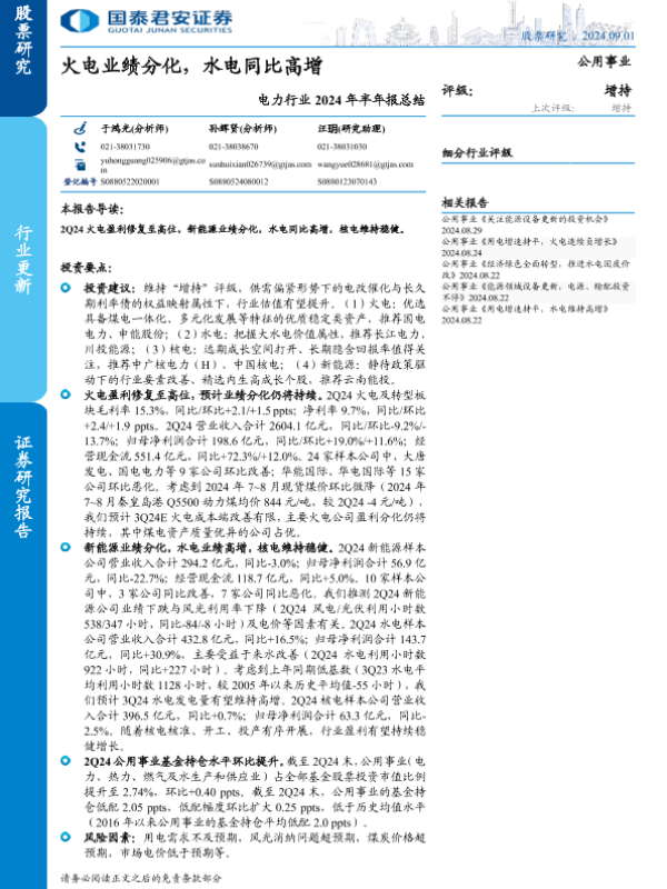 【国泰君安证券】【20240901】电力行业2024年半年报总结:火电业绩分化,水电同比高增-13页
