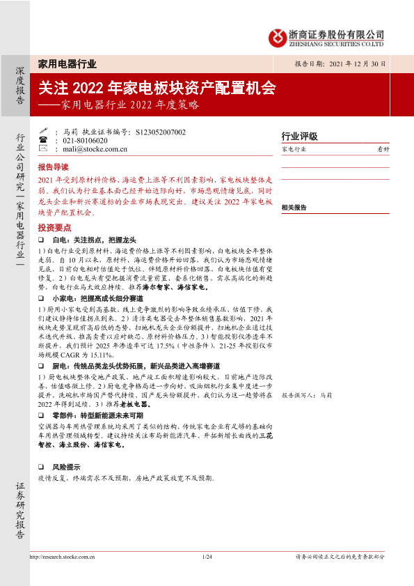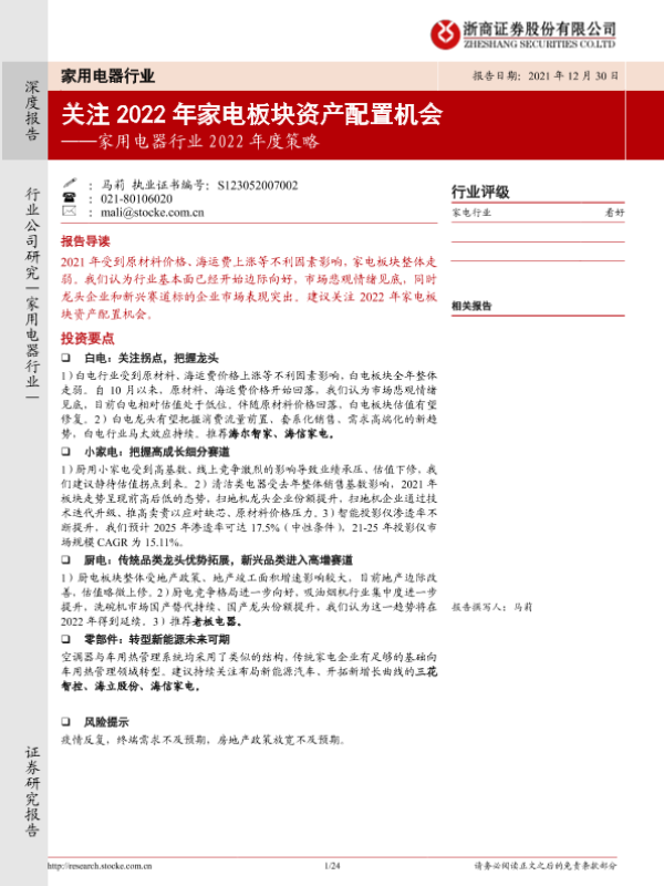 【浙商证券】【20211230】家用电器行业2022年度策略:关注2022年家电板块资产配置机会-24页
