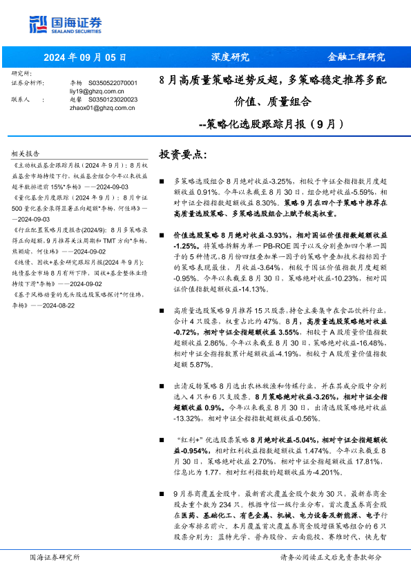 【国海证券】【20240905】策略化选股跟踪月报(9月):8月高质量策略逆势反超,多策略稳定推荐多配价值、质量组合-34页