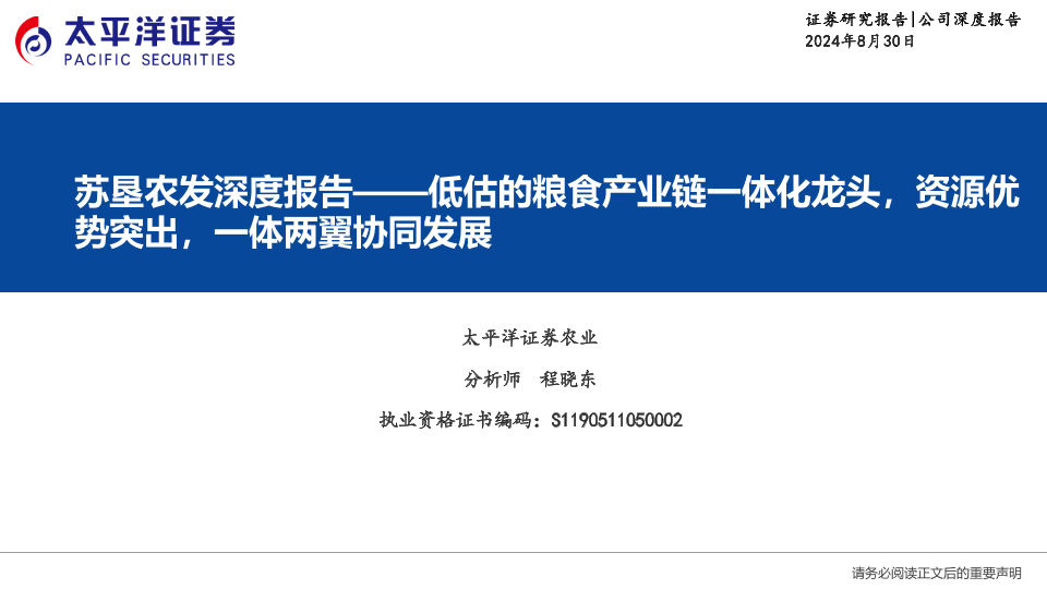 【太平洋证券】【20240830】苏垦农发(601952)深度报告:低估的粮食产业链一体化龙头,资源优势突出,一体两翼协同发展-27页